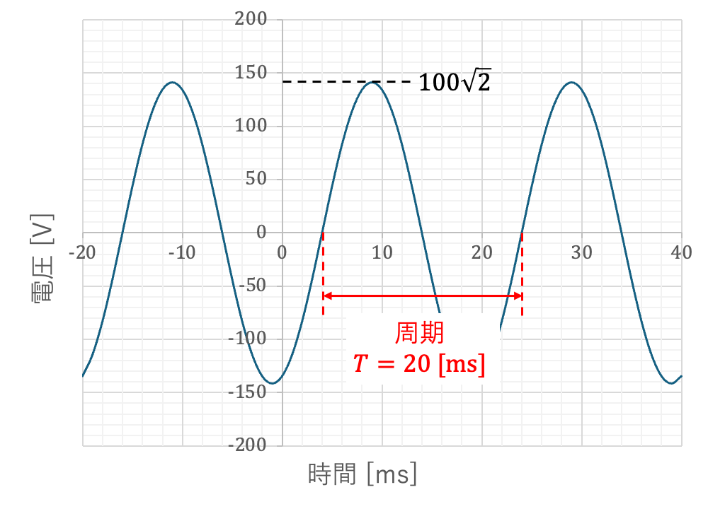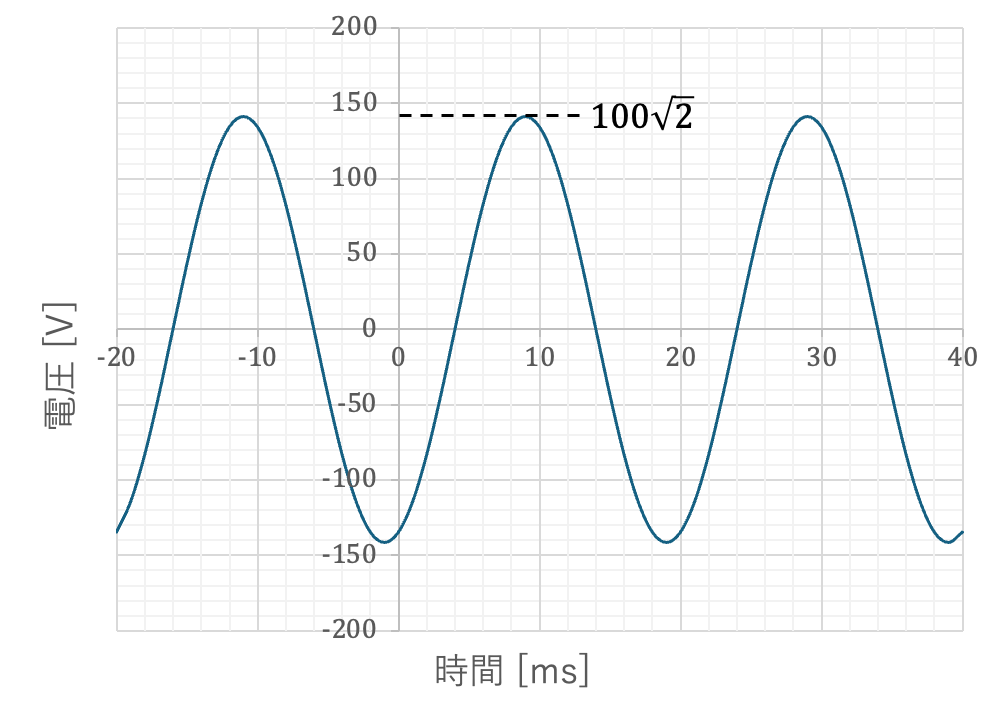 振幅 V_{max} = 100\sqrt{2} \mathrm{\,[V]}