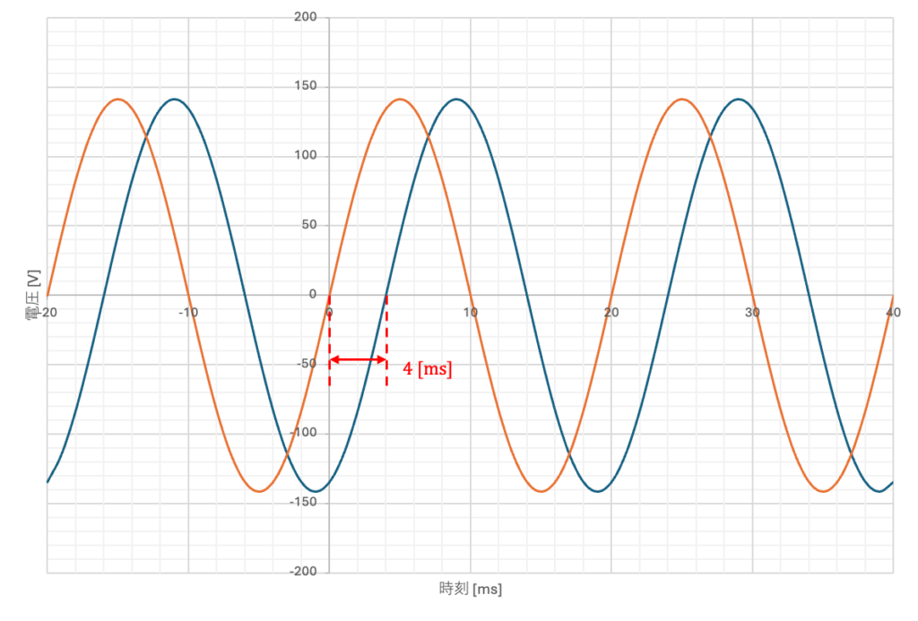 上の図を見ると、今回の波形は、sin波が時間軸方法に右へ 4 [ms] 移動したものなので位相角は、