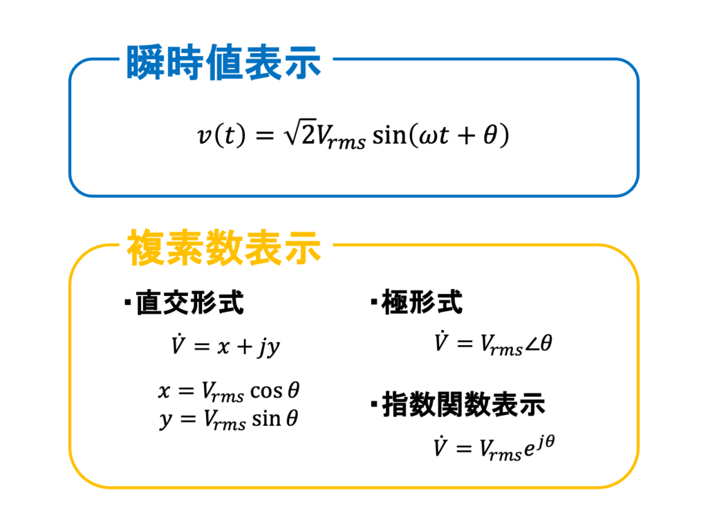 | 複素数表示(直交形式) | \dot{V}=50\sqrt{2}+j50\sqrt{2} | 足し算・引き算が簡単 |